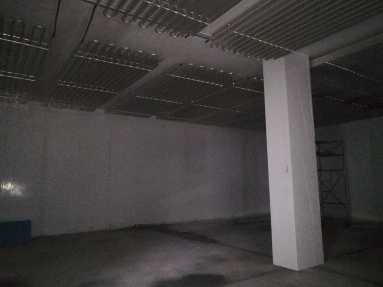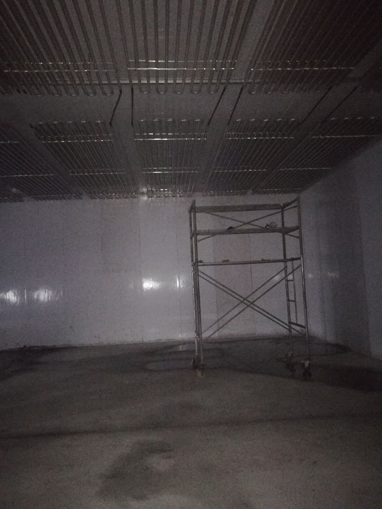 冷庫(kù)采用120mm聚氨酯保溫板雙面彩鋼板,地面鋪設(shè)100mm擠塑板后鋪設(shè)100mm水泥。